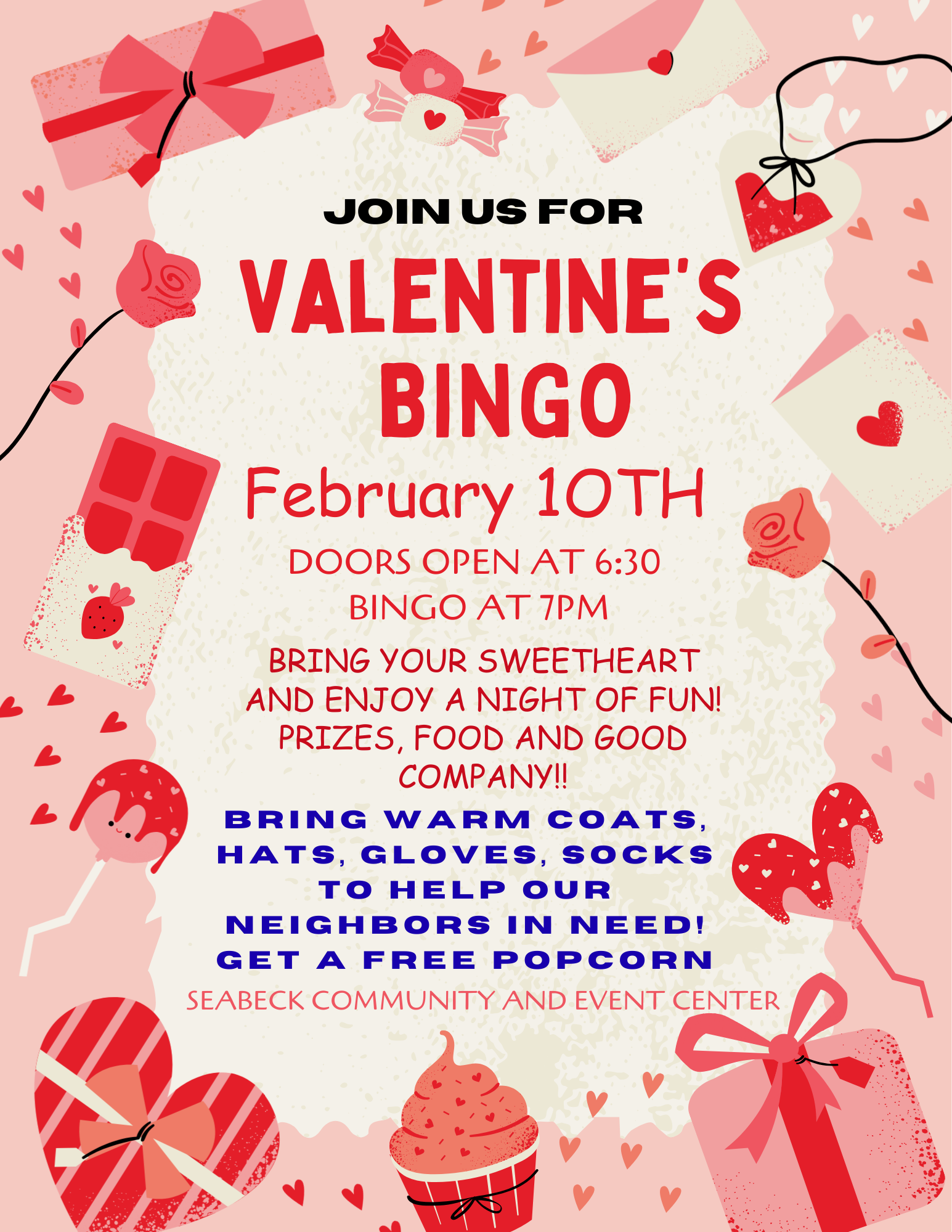 We are having a Valentine's themed BINGO. If you have any fun tablecloths or decor plesae bring something for your table. Wear your favorite color of love and don’t forget to bring your sweetheart.